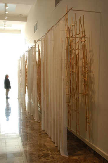 The Veiling, 2003 site specific, hand carved white pine, hand crocheted cotton fiber, and video